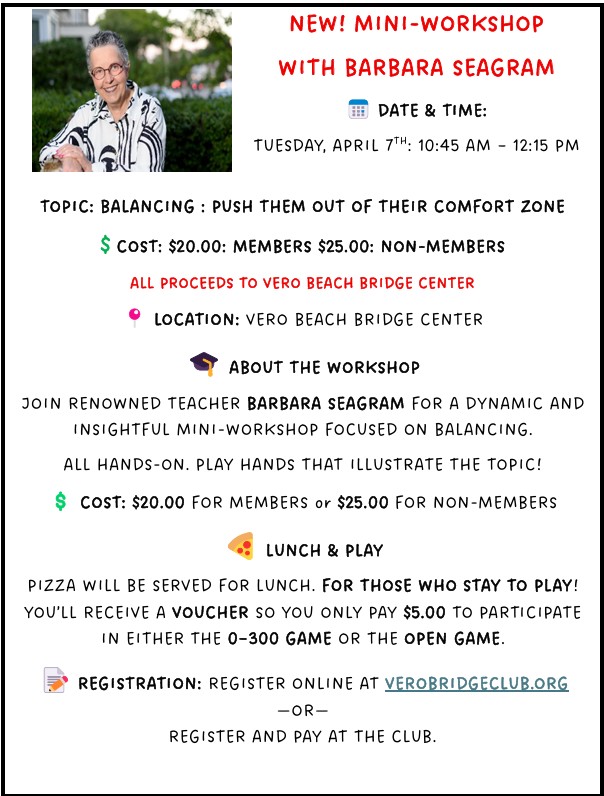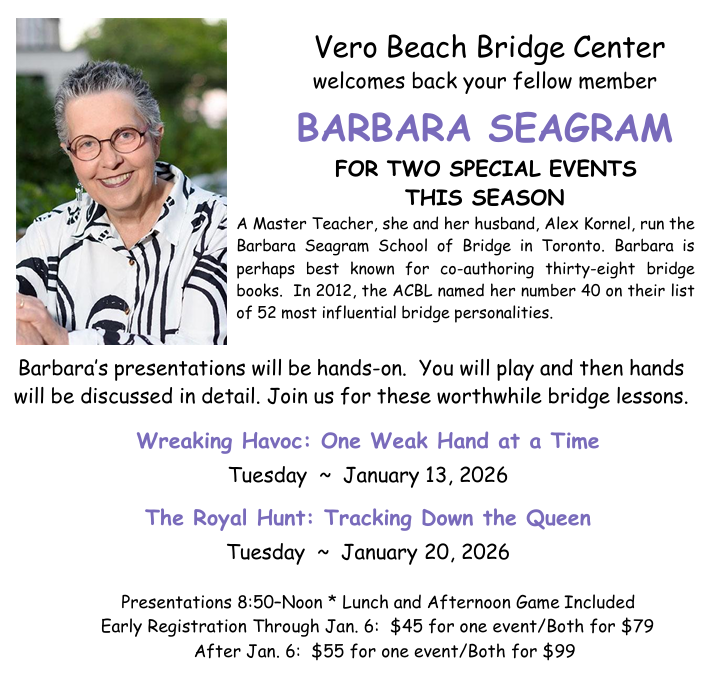 Barbara Seagram has a wonderful collection of learning materials for bridge players at all levels. A long time friend and supporter of Vero Beach Bridge Center, Barbara has offered to donate a portion of any purchase of her learning aids to VBBC.