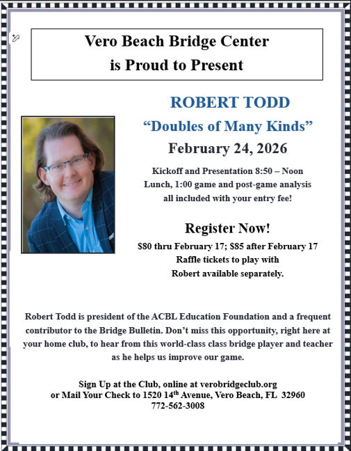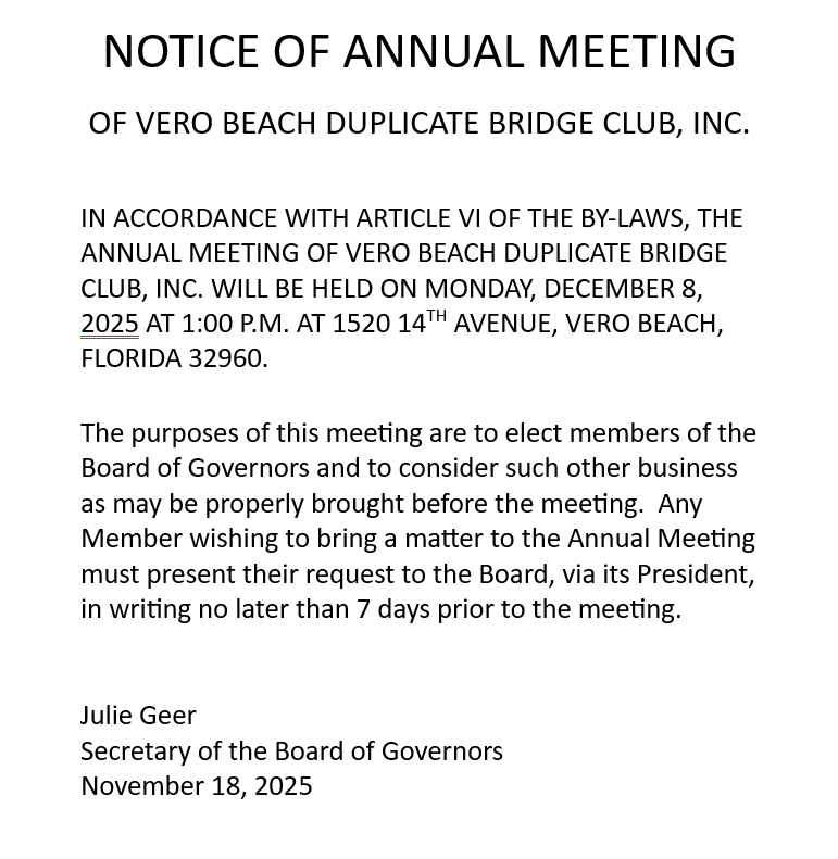 Thank you to Barbara Seagram and Alex Kornel for your work and dedication to Vero Beach Bridge Center, helping to make our Club One of the Finest in the Country!